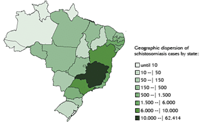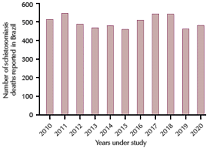 Table 2 – Number of deaths due to schistosomiasis in the different regions of Brazil (2010-2020) Year Brazilian regions North Northeast Southeast South Midwest 2010 0 324 177 4 9 2011 0 365 169 2 10 2012 0 309 168 3 8 2013 3 294 153 3 15 2014 2 306 161 2 9 2015 2 304 144 1 10 2016 1 346 150 4 8 2017 2 363 168 2 8 2018 4 340 186 2 10 2019 2 301 146 3 10 2020 5 314 149 6 8 Total 21 3.566 1.771 32 105 Source: Author’s preparation with data from SIM11.