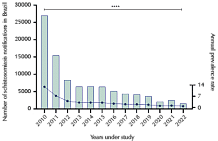Table 1 – Social and demographic profile of schistosomiasis patients in Brazil (2010 and 2022) Sex n Male 57.066 Female 36.445 Ignored/blank 10 Race n White 23.793 Black 8.083 Yellow 1.156 Mixed race 46.611 Indigenous 472 Ignored/blank 13.406 Education level n Illiterate 3.009 1st to 4th grade incomplete elementary school 13.992 4th complete grade of elementary school 5.986 5th to 8th grade incomplete elementary school 12.477 Complete elementary school 4.766 Incomplete high school 5.048 Complete high school 8.036 Complete higher education 1.625 Incomplete higher education 692 Ignored/blank 37.890 Age group n Less than 1 year old 920 1-4 years old 986 5-9 years old 4.349 10-14 years old 8.577 15-19 years old 8.510 20-39 years old 34.997 40-59 years old 25.303 60-64 years old 3.659 65-69 years old 2.586 70-79 years old 2.728 80 years old or older 886 Ignored/blank 20 Source: Author’s preparation with data from SINAN10. n is the raw number of notifications related to the described feature.
